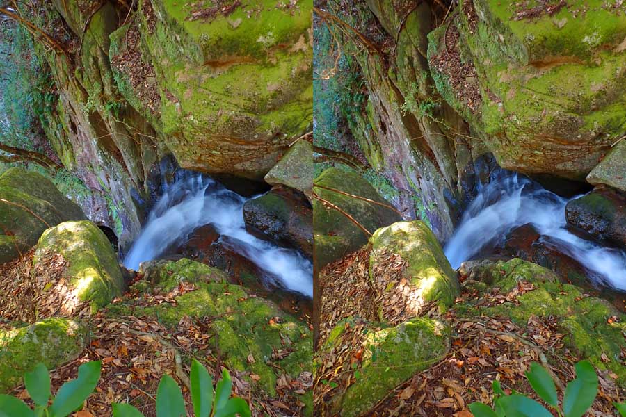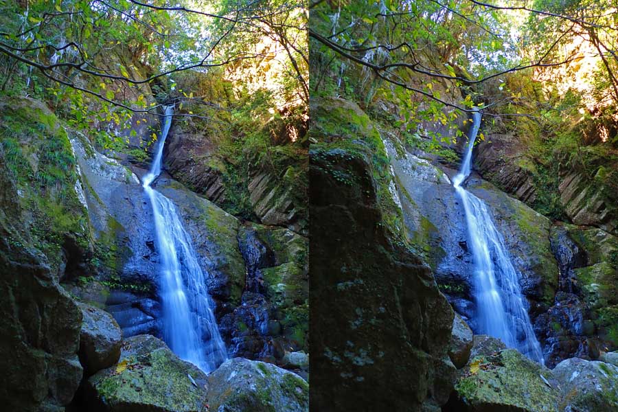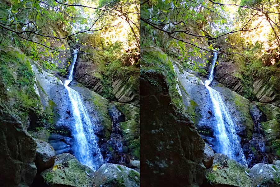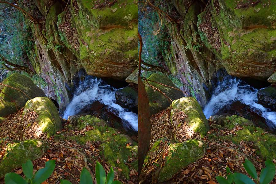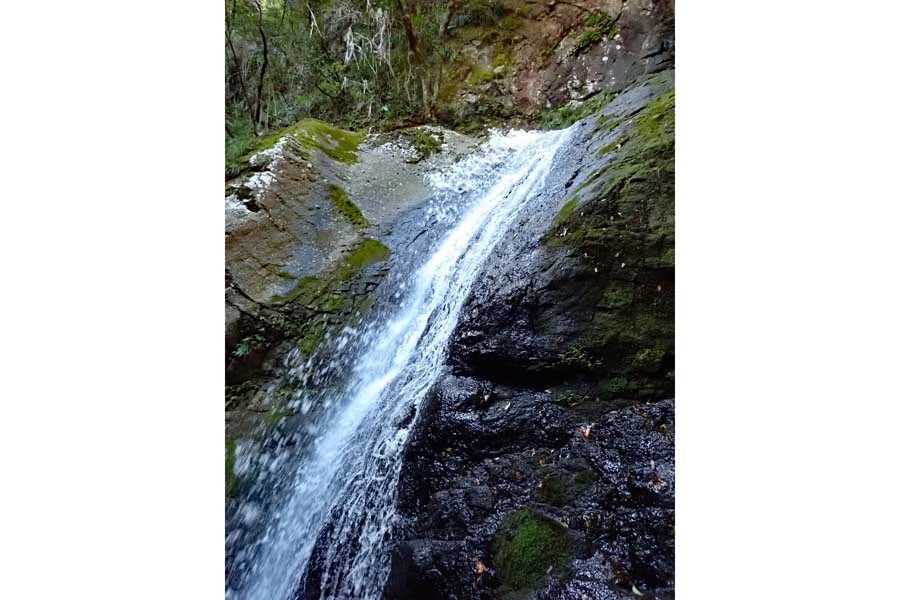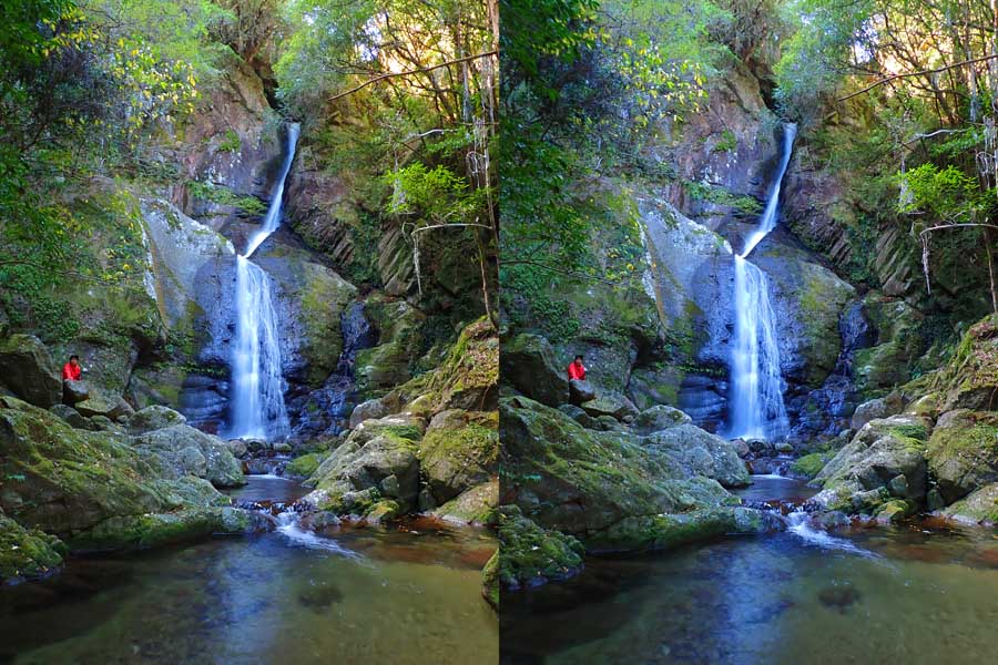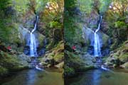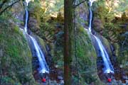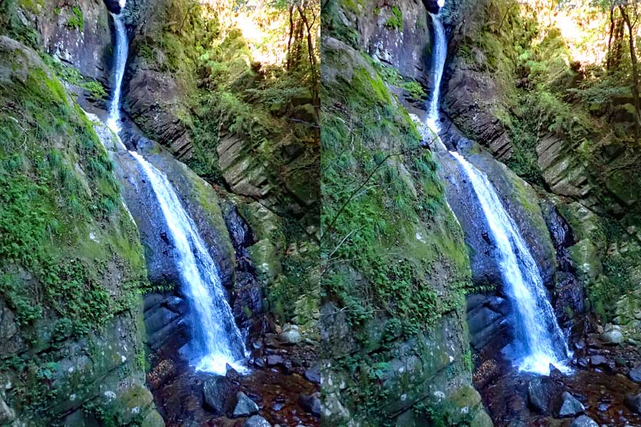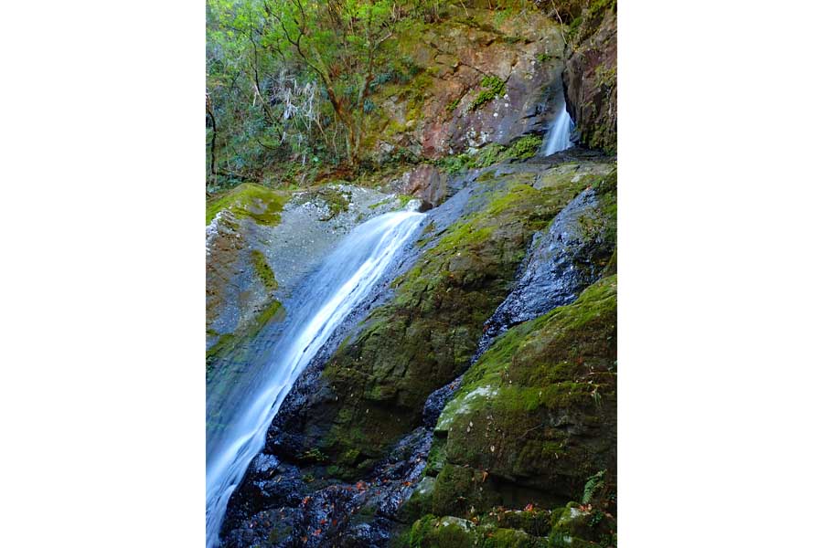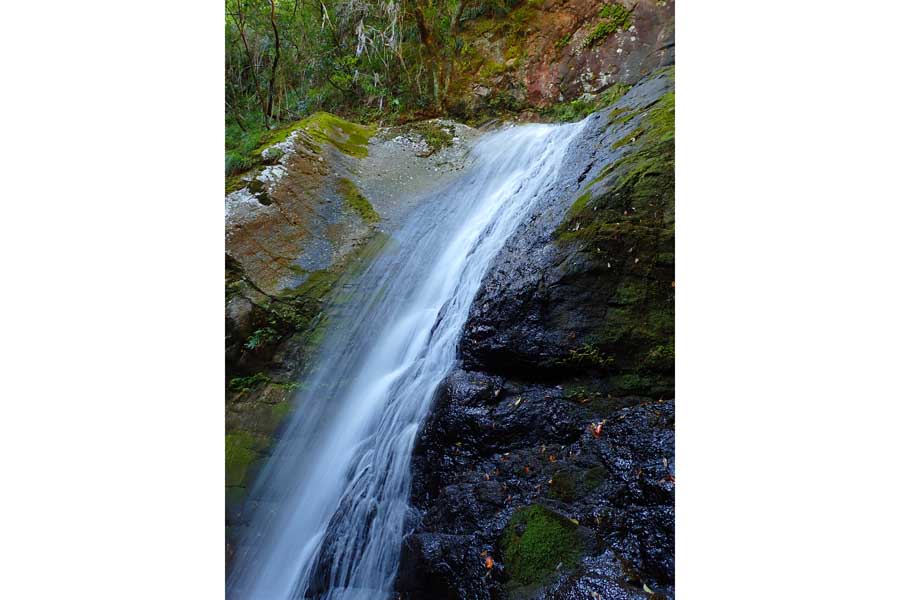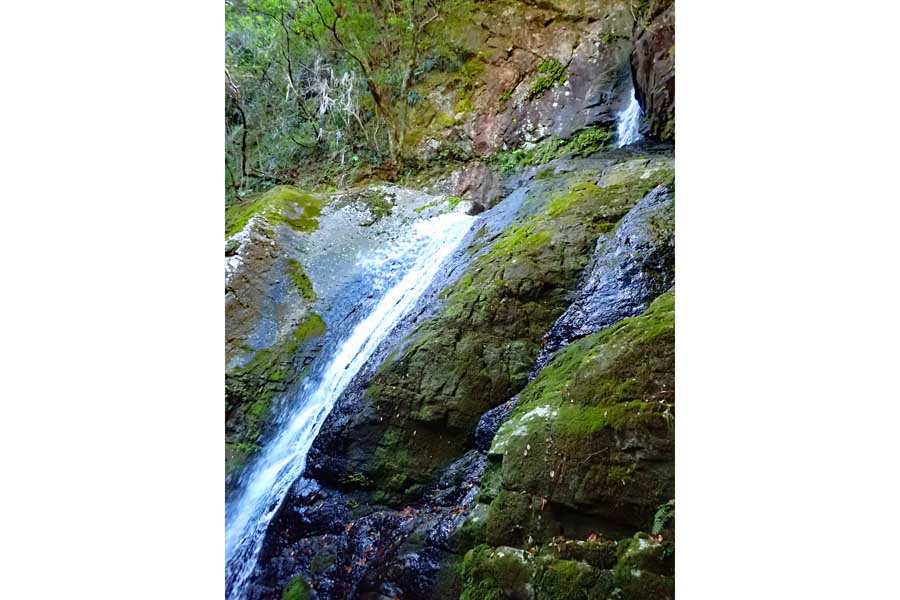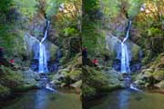 | なぜか淑子さんが左岸をどんどん登っていきます。そちらに杣道があるはずなので私も登ります。おかげで落口も撮影できました。淑子さんと私は杣道を、ゆかりんとノリ君は谷沿いを戻りました。 | |||