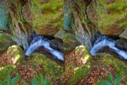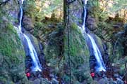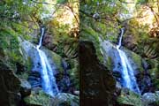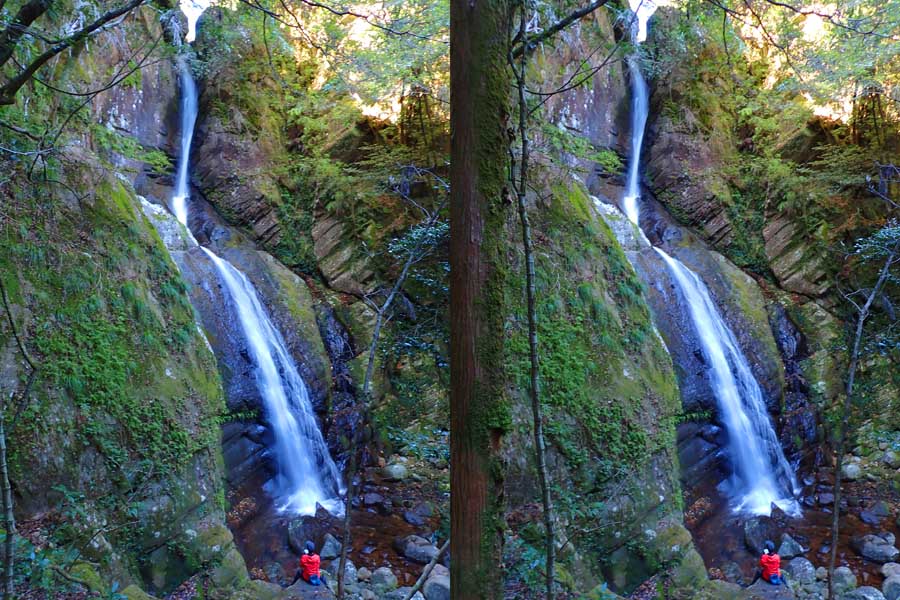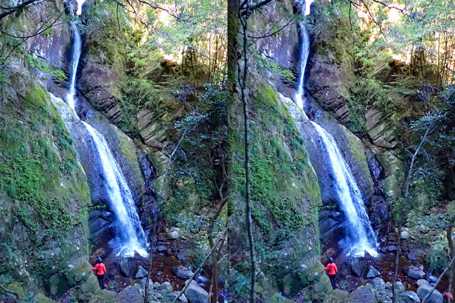| 駐車場所から少し歩き谷に降りるのですが、気づかずまっすぐ行こうとしました。ゆかりんが気づいて止めてくれました。前回の記事を見ると、降り口に赤テープを巻いたとあるのに・・・。程なく滝前です。滝は二段に落ちています。 | |||