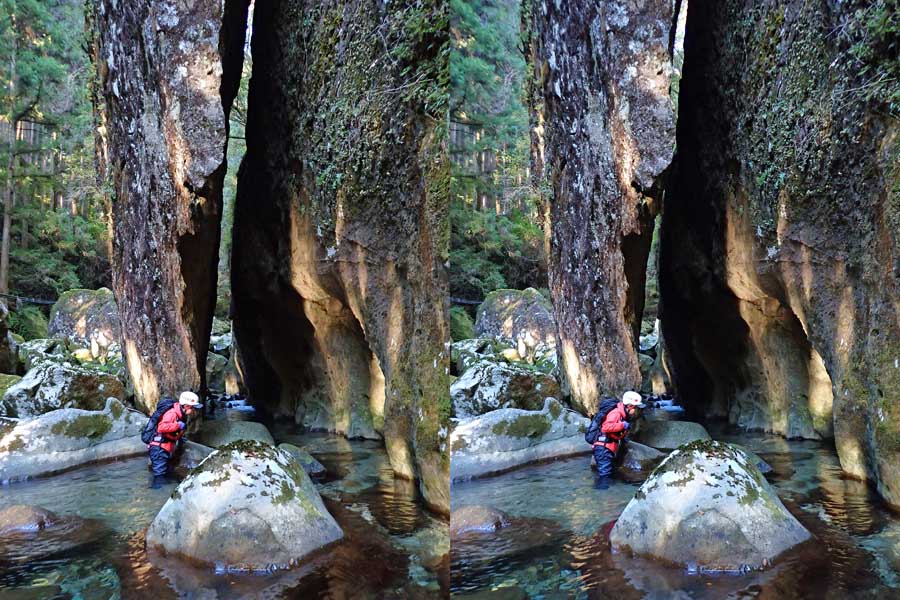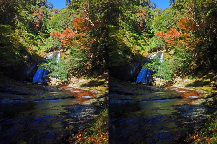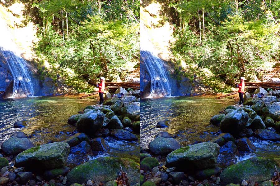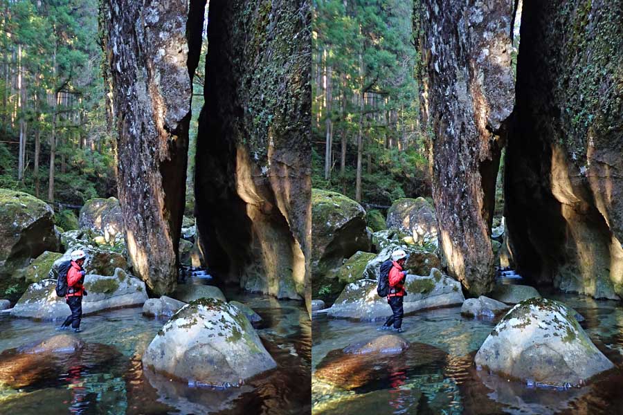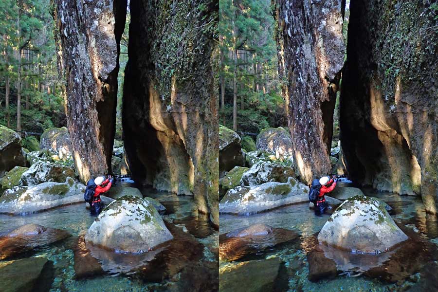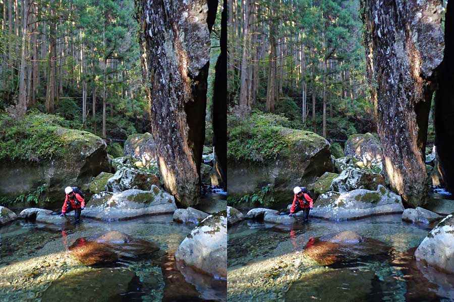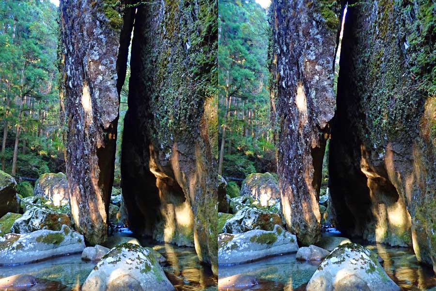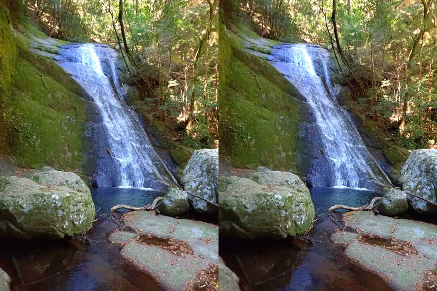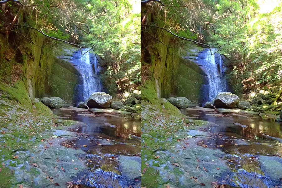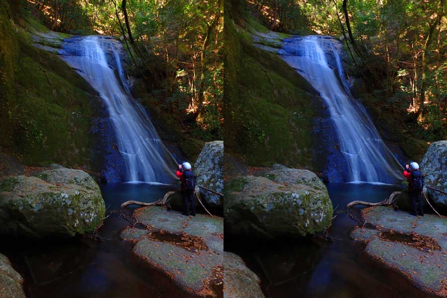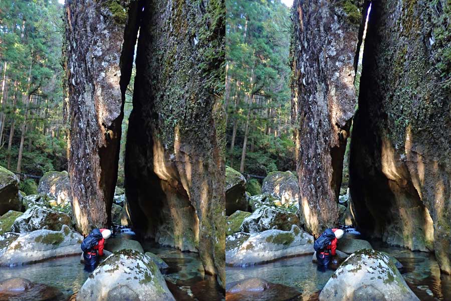 | 駐車場所から集落の中の細い道を登る。朝一番の登りが微妙にきつい・・・。最初の見所は一枚岩。古座川の一枚岩には及ばないが、水の美しさが際立つ。朝日に照らされた岩山が黄金色に輝いていた。 | ||||