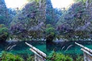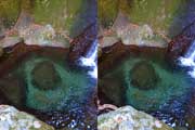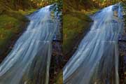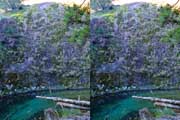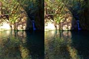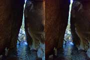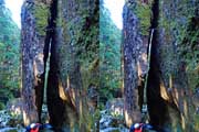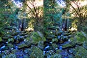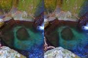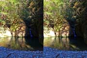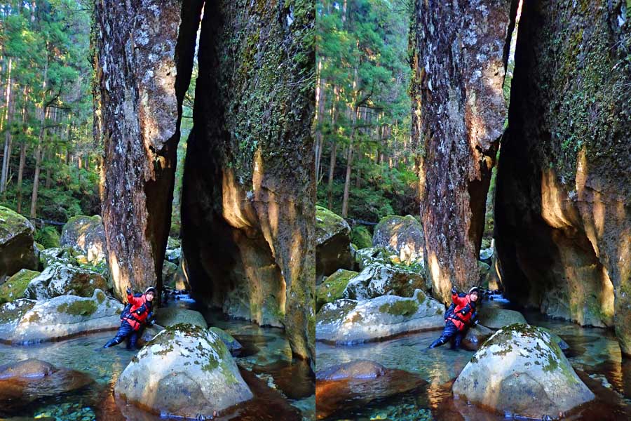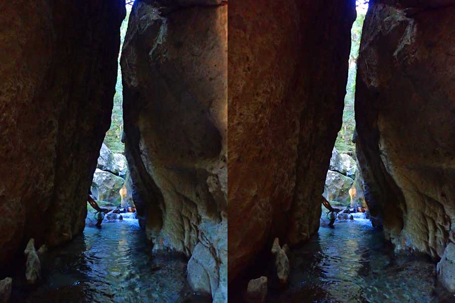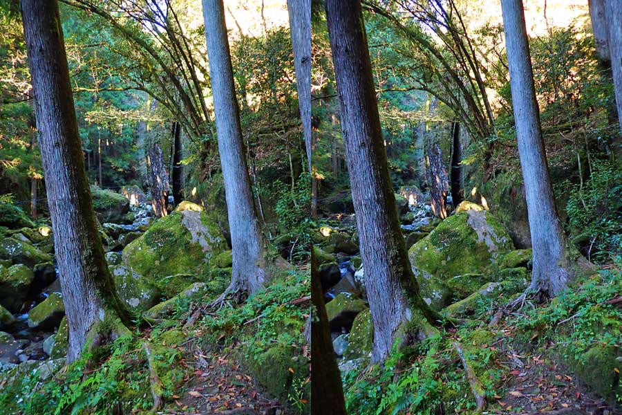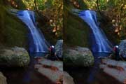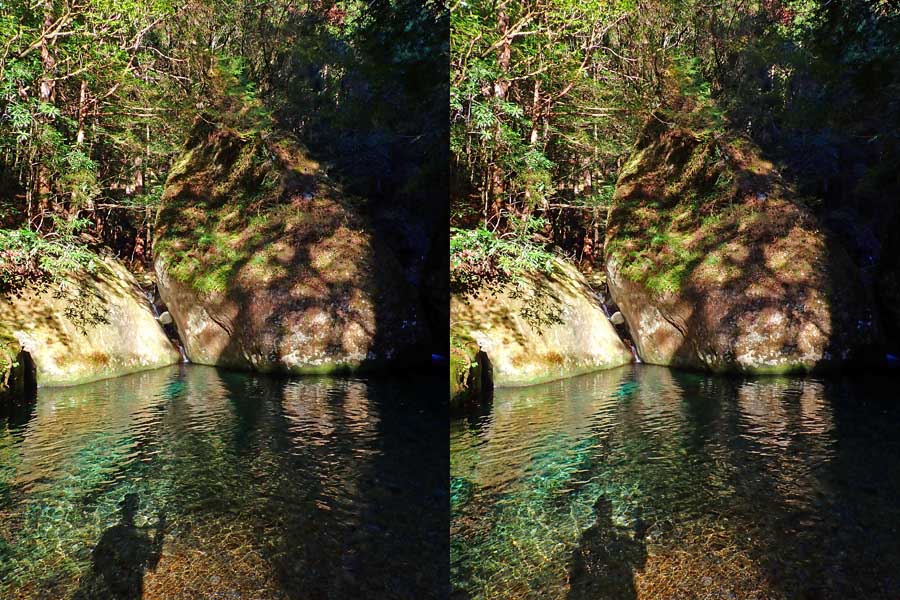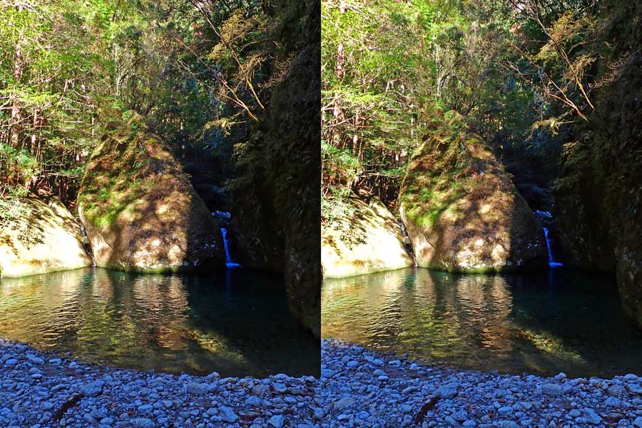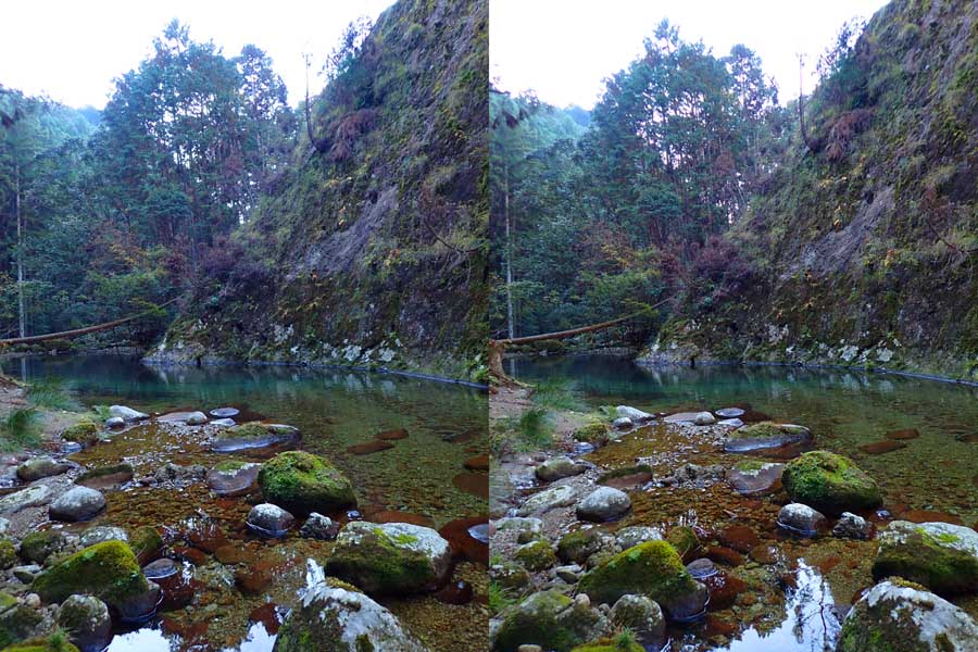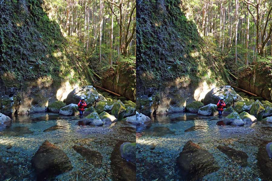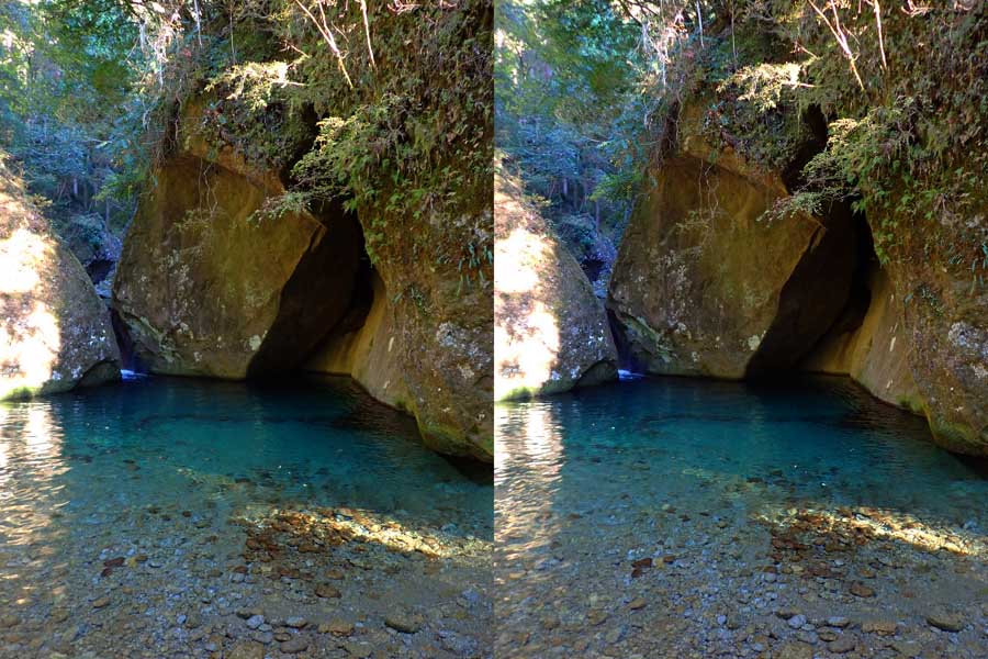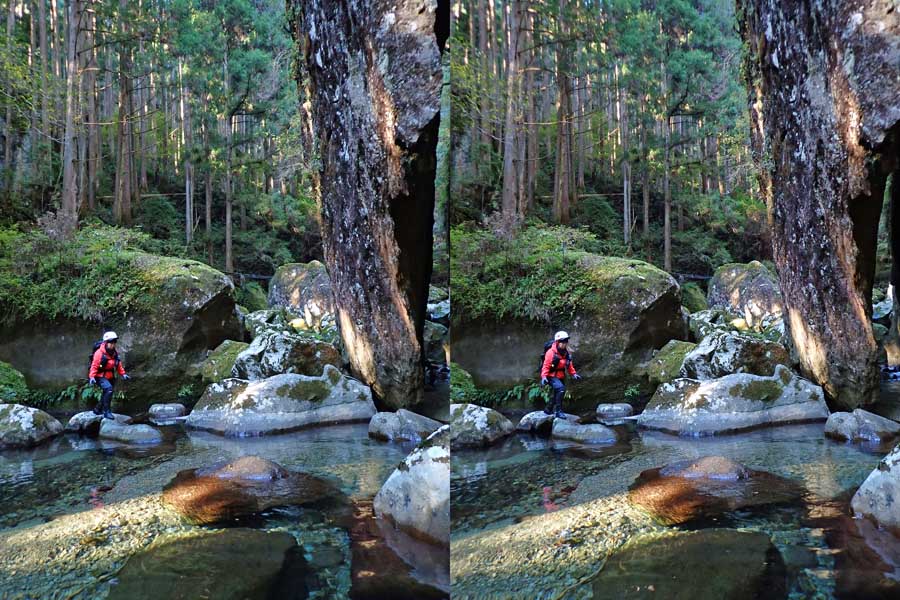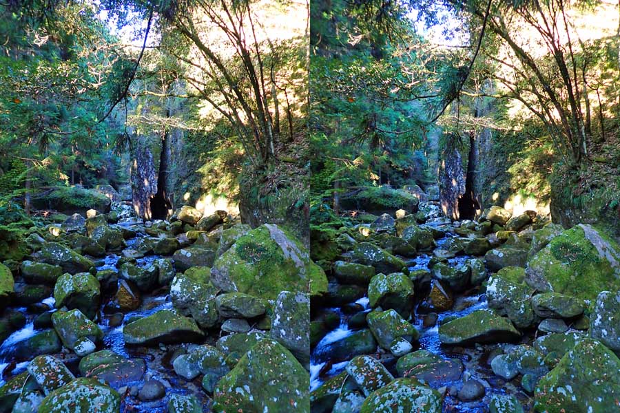 | 駐車場所から集落の中の細い道を登る。朝一番の登りが微妙にきつい・・・。最初の見所は一枚岩。古座川の一枚岩には及ばないが、水の美しさが際立つ。朝日に照らされた岩山が黄金色に輝いていた。 | ||||