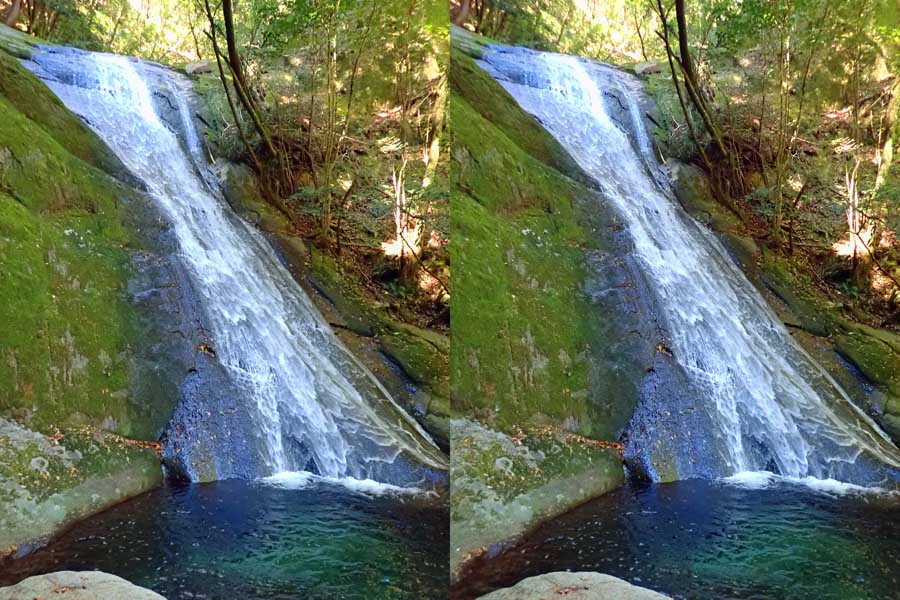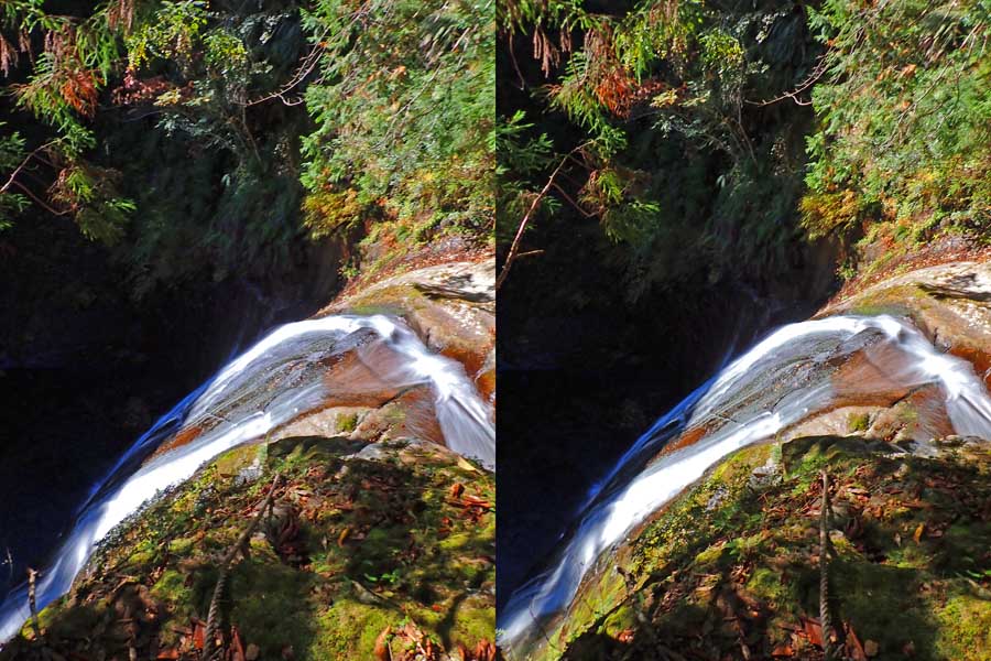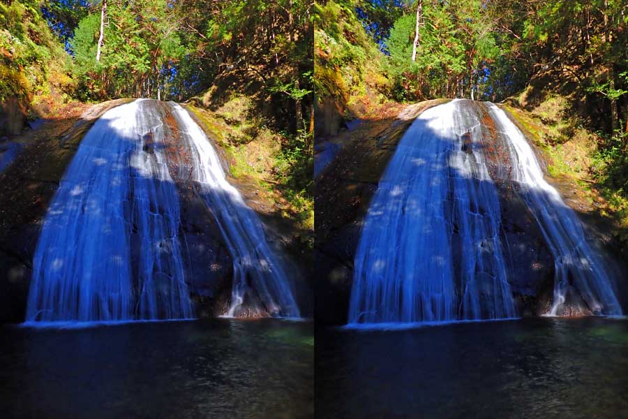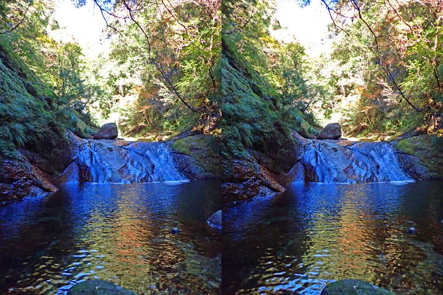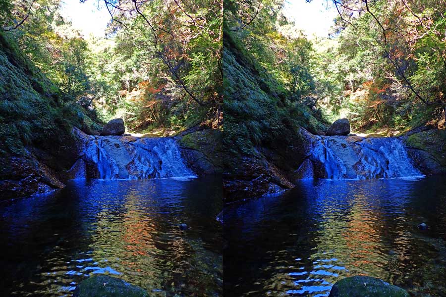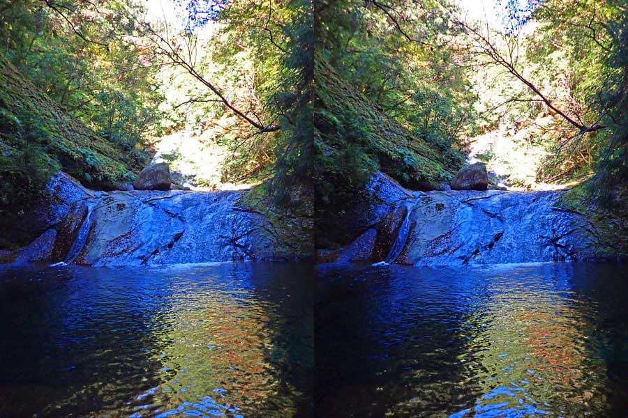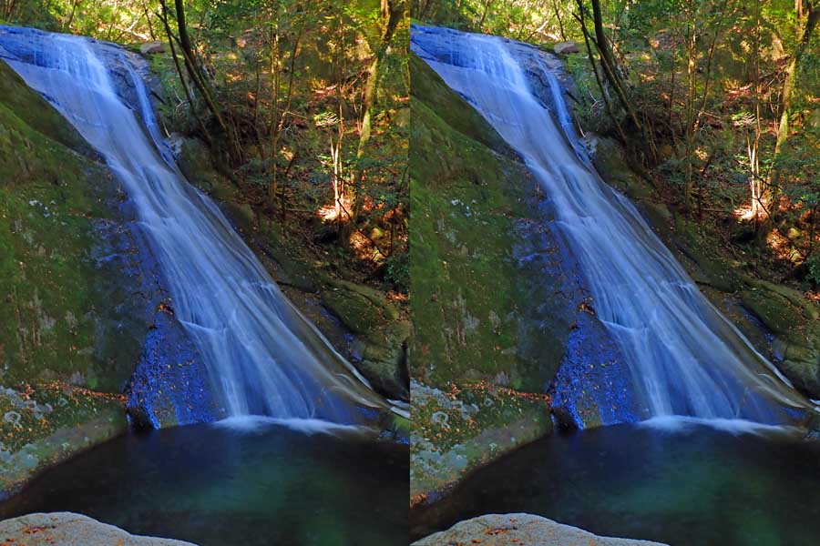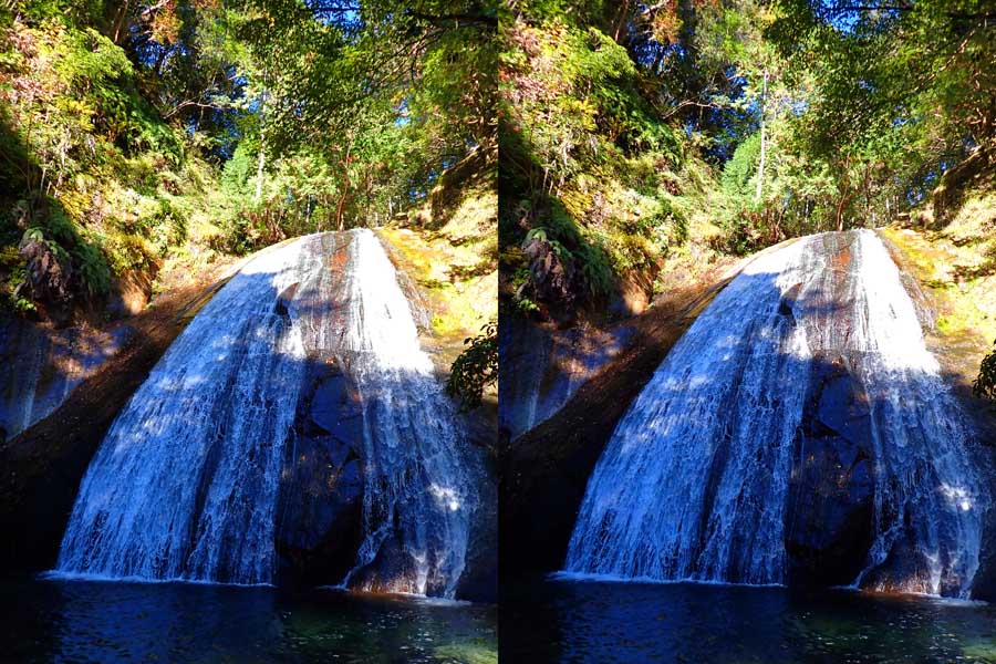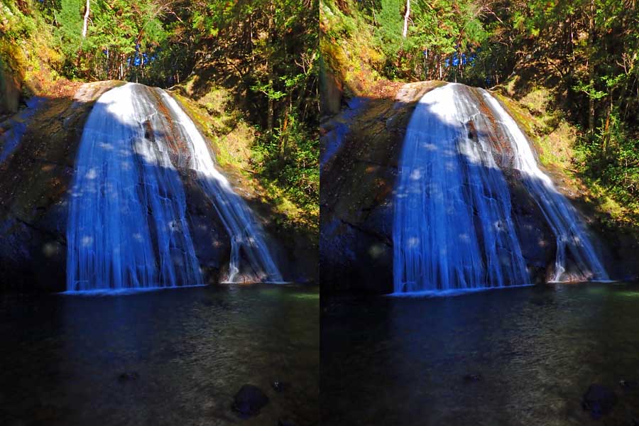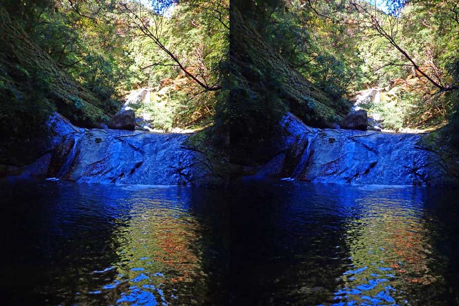 | 日陰のせいか、青い落水になりました。遊歩道には戻らず、そのまま滝横を登る。初回以外は滝横を通過して上流の木馬道で下山するので、この部分の遊歩道を歩いたことが無かったです。今回は復路で歩いたけど、結構傷みが激しかったです。 | |||
