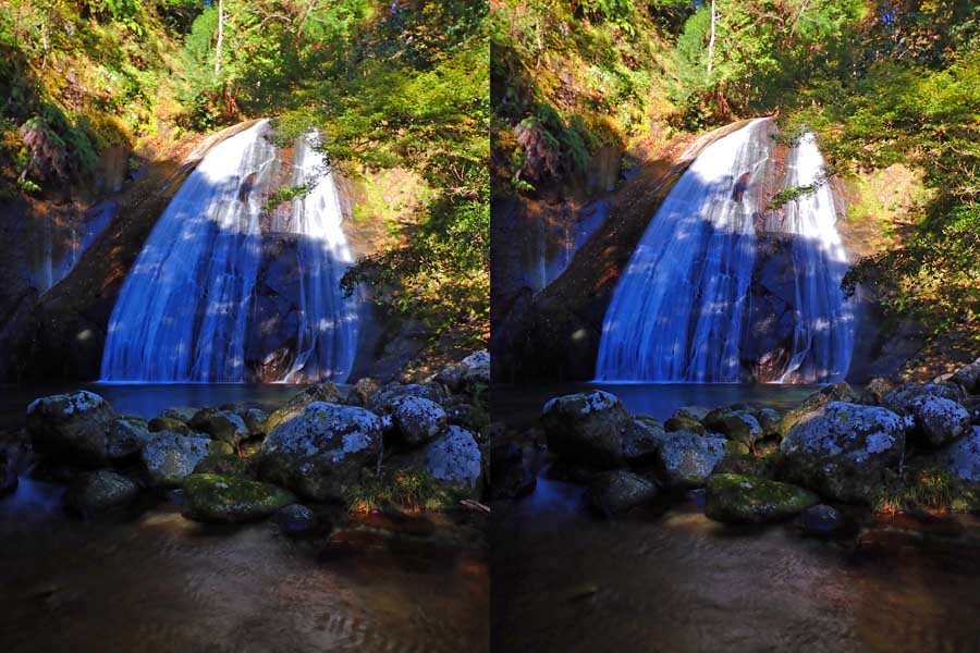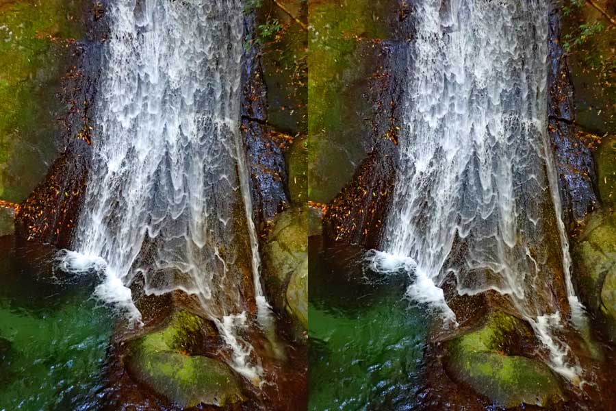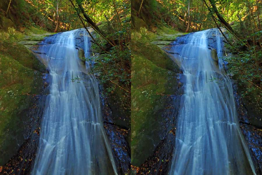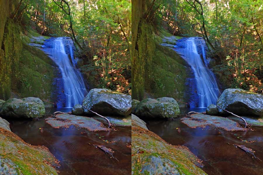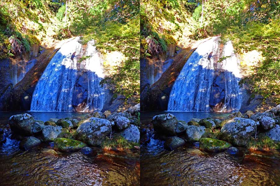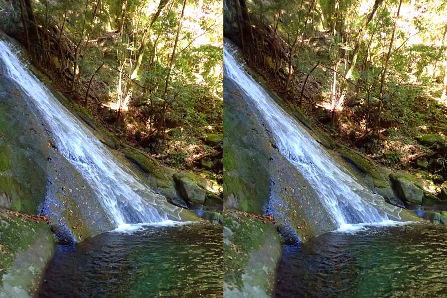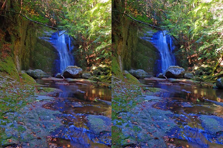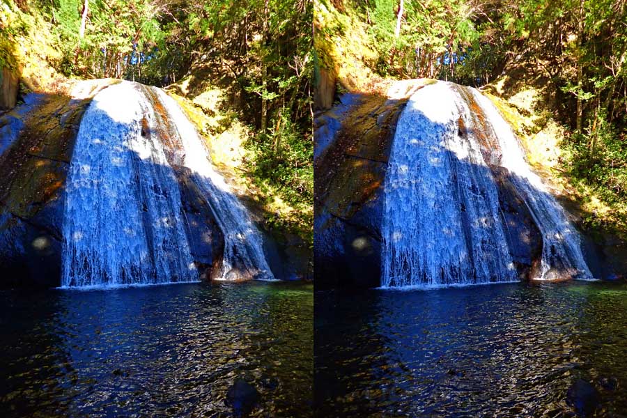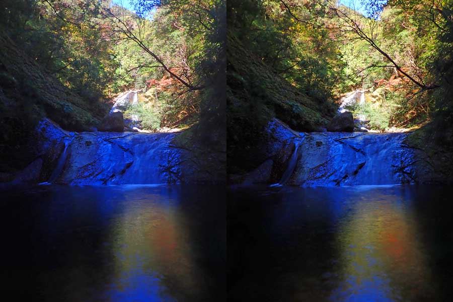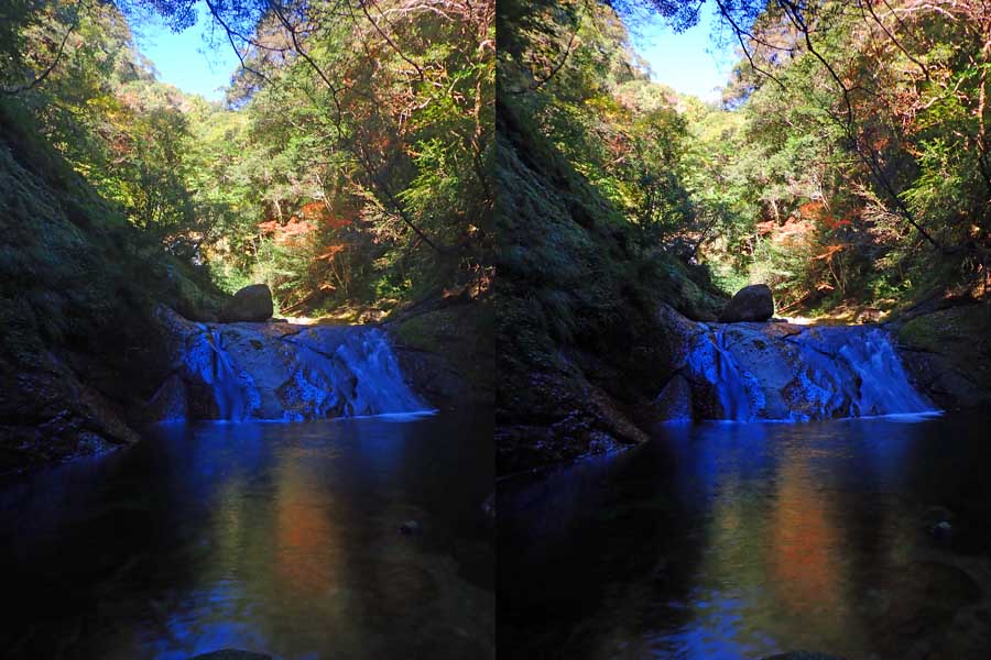 | 日陰のせいか、青い落水になりました。遊歩道には戻らず、そのまま滝横を登る。初回以外は滝横を通過して上流の木馬道で下山するので、この部分の遊歩道を歩いたことが無かったです。今回は復路で歩いたけど、結構傷みが激しかったです。 | |||