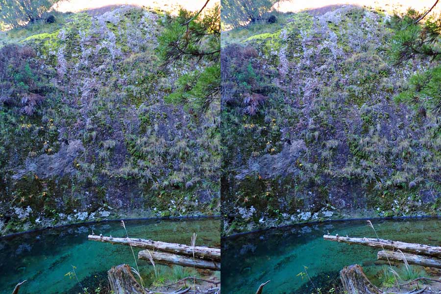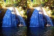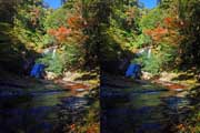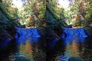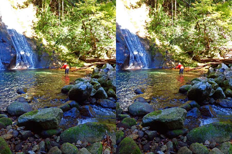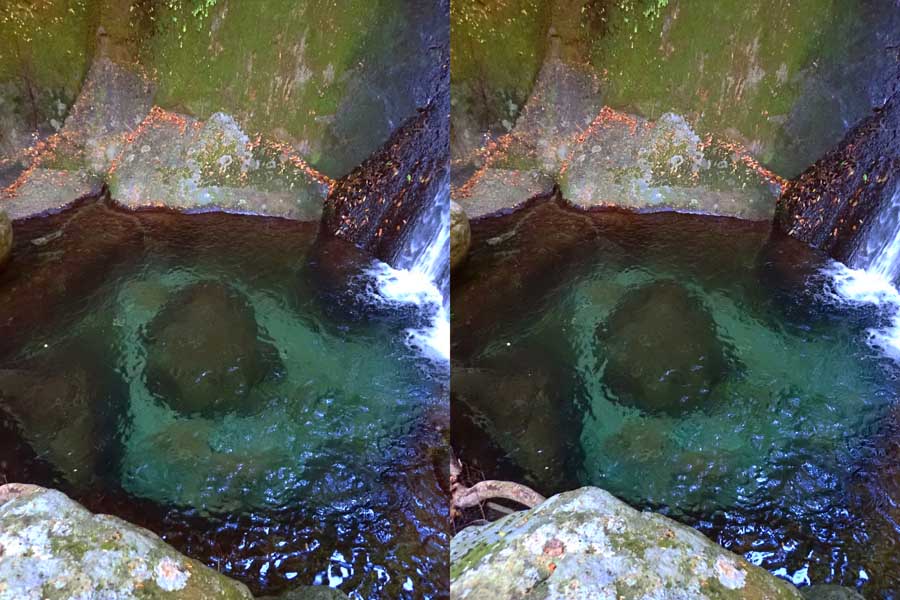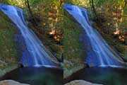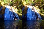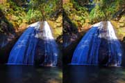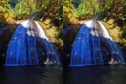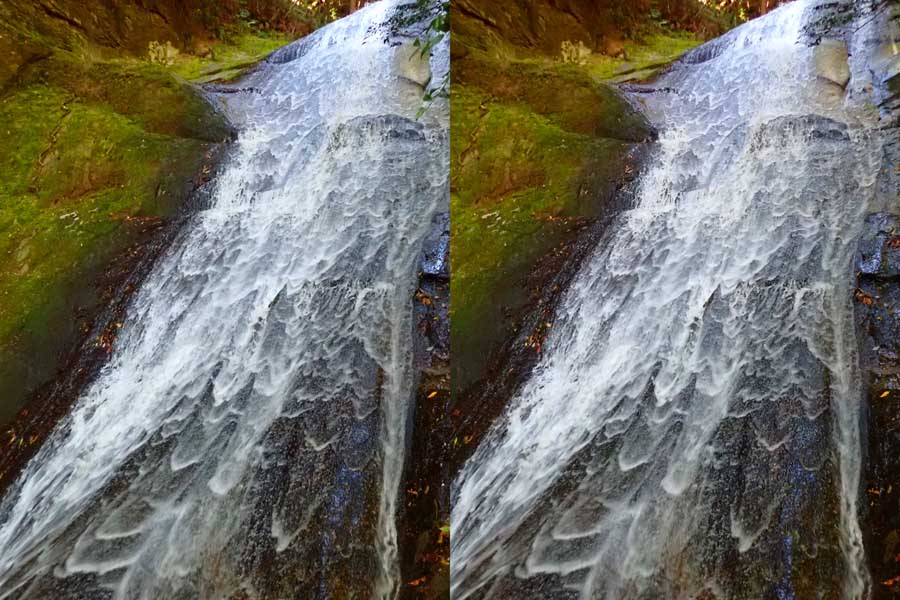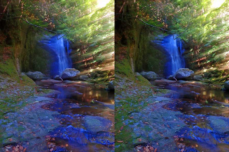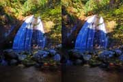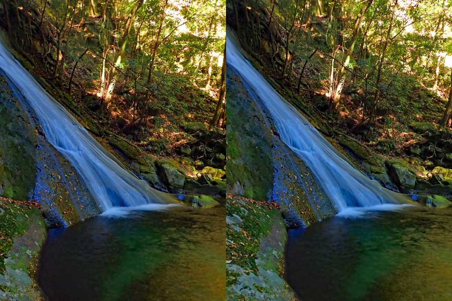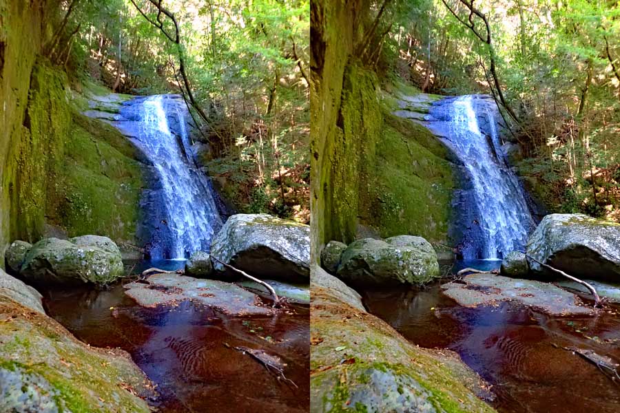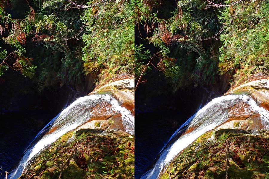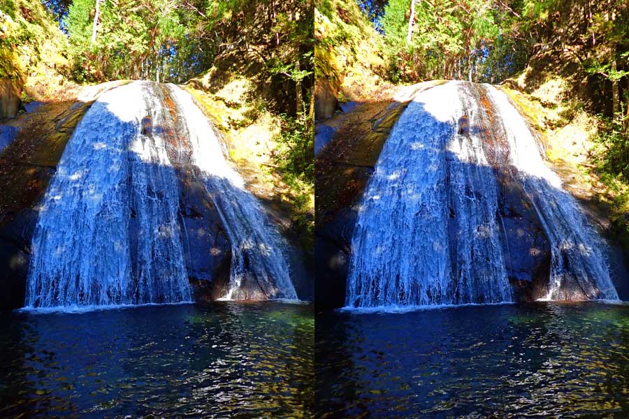 | 日陰のせいか、青い落水になりました。遊歩道には戻らず、そのまま滝横を登る。初回以外は滝横を通過して上流の木馬道で下山するので、この部分の遊歩道を歩いたことが無かったです。今回は復路で歩いたけど、結構傷みが激しかったです。 | |||