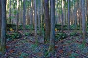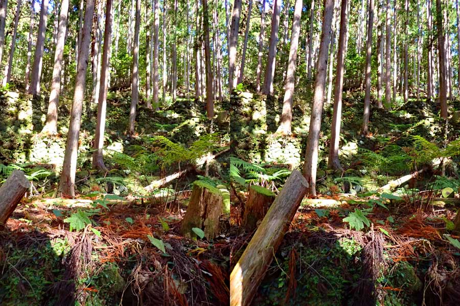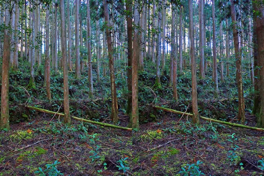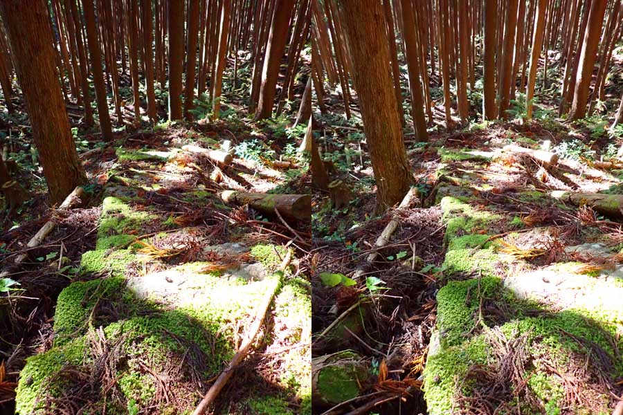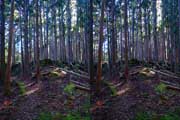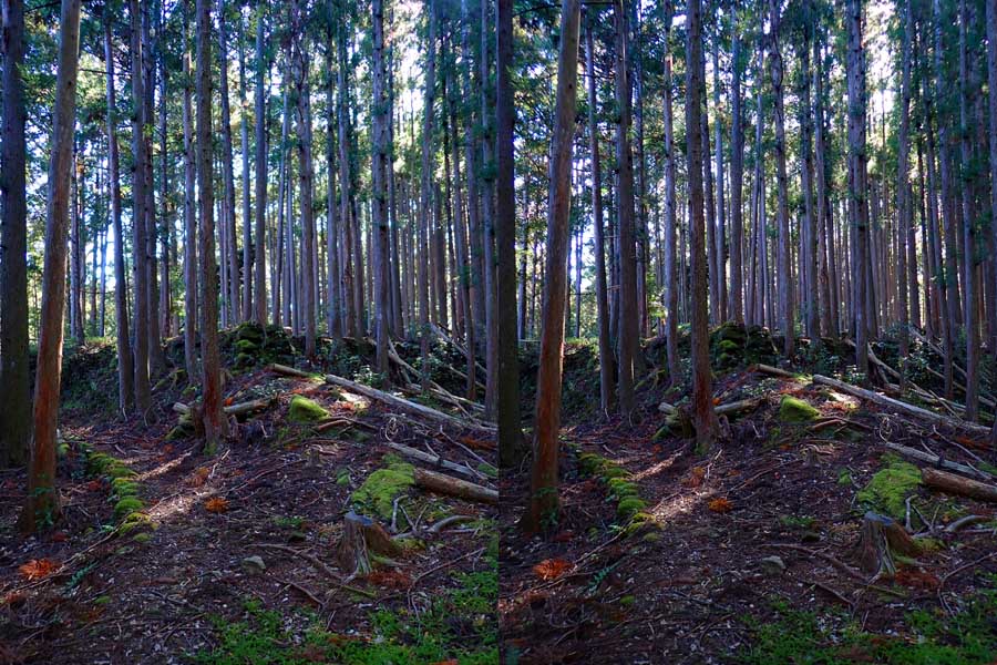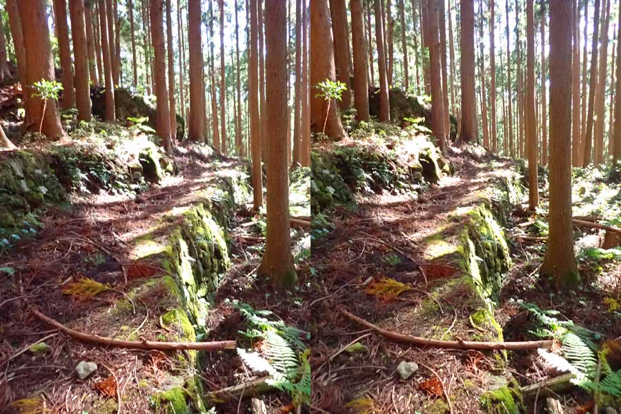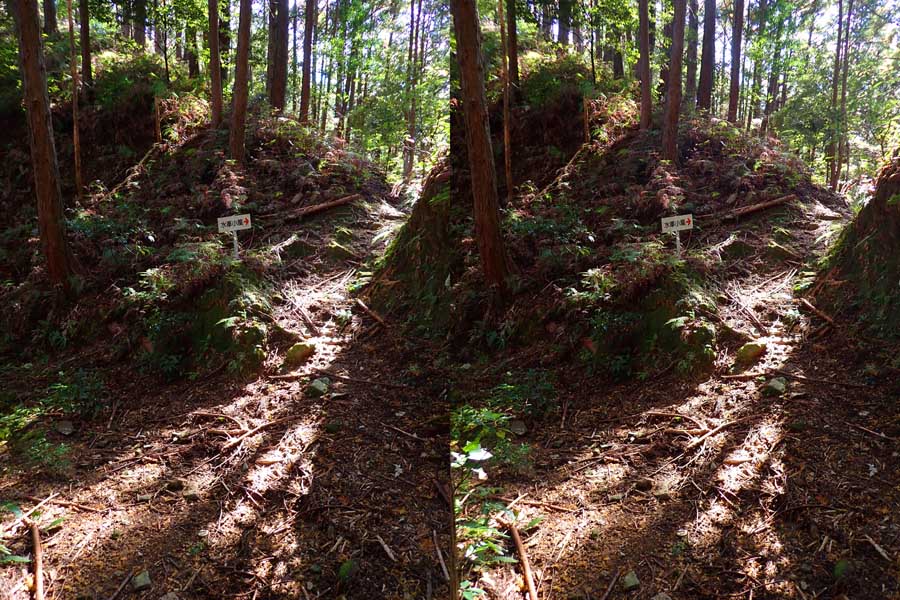 | ナマズ口少し下流の分岐点まで戻り悩みます。川沿いを下るか『水車小屋』の案内板を信じて自然歩道を進むか・・・。自然歩道を選びました。棚田跡と思われる人工林を進みます。場所によっては屋敷跡か砦跡と思われる場所もありました。 | ||||