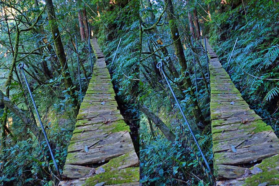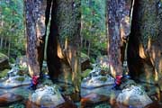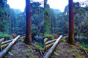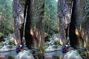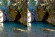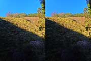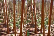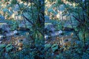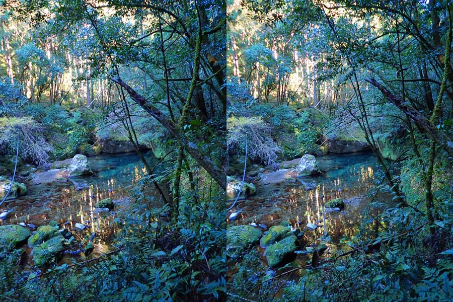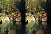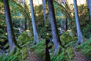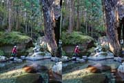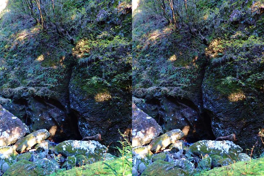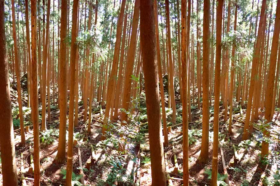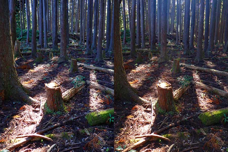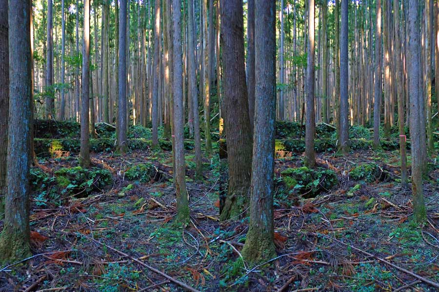 | ナマズ口少し下流の分岐点まで戻り悩みます。川沿いを下るか『水車小屋』の案内板を信じて自然歩道を進むか・・・。自然歩道を選びました。棚田跡と思われる人工林を進みます。場所によっては屋敷跡か砦跡と思われる場所もありました。 | ||||