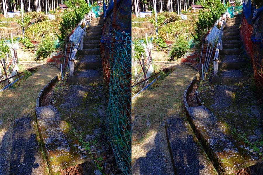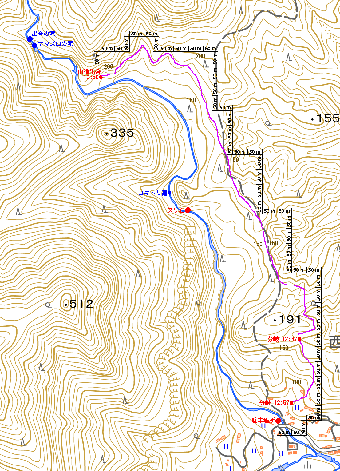 | いつの間に尾根を歩き、191mピークの東側に回りこんだあと標高を下げて集落の中で遊歩道と合流しました。歴史を感じさせる景観を楽しめますが、川沿いルートより2,30分程度余分に時間がかかったと思います。 | |||