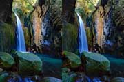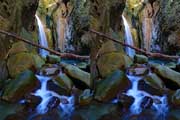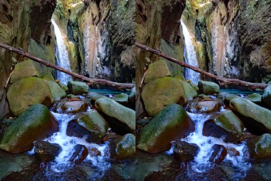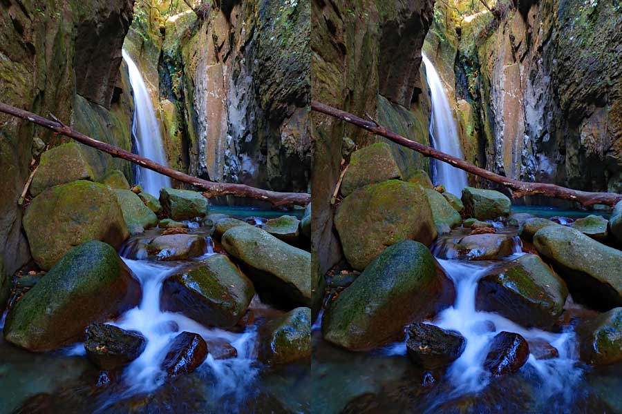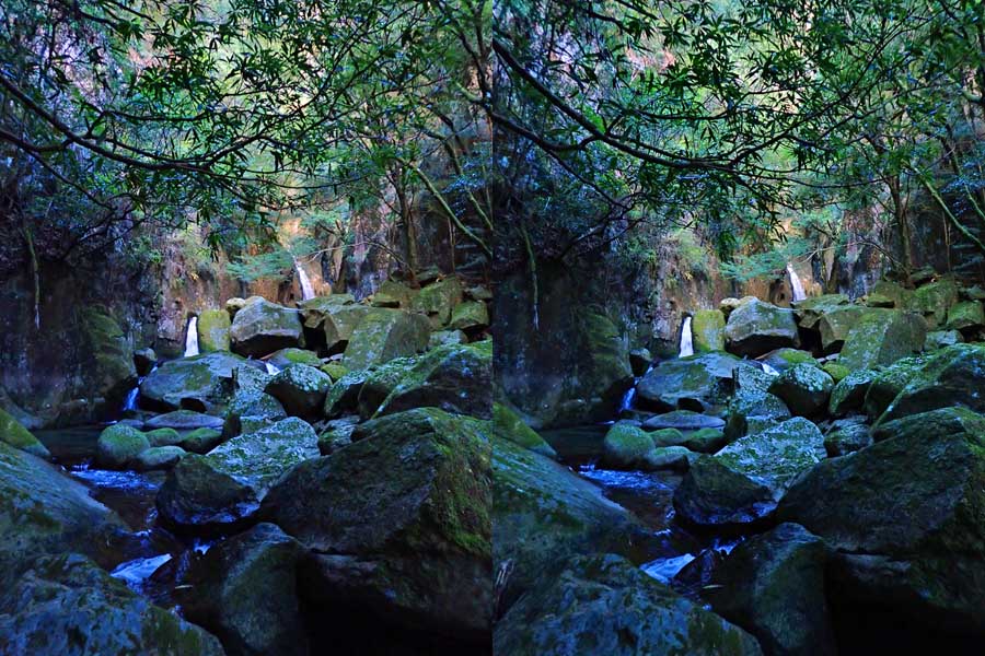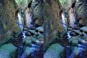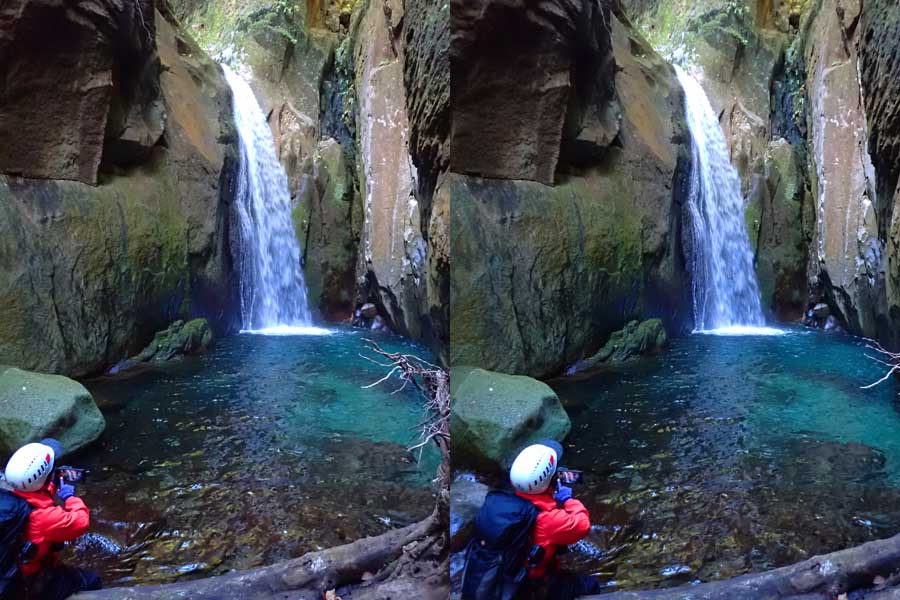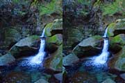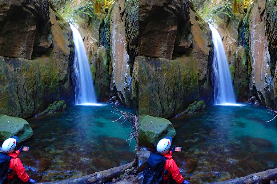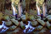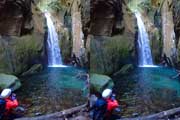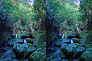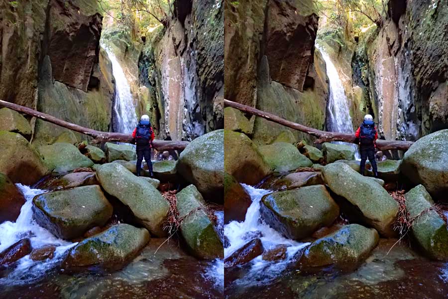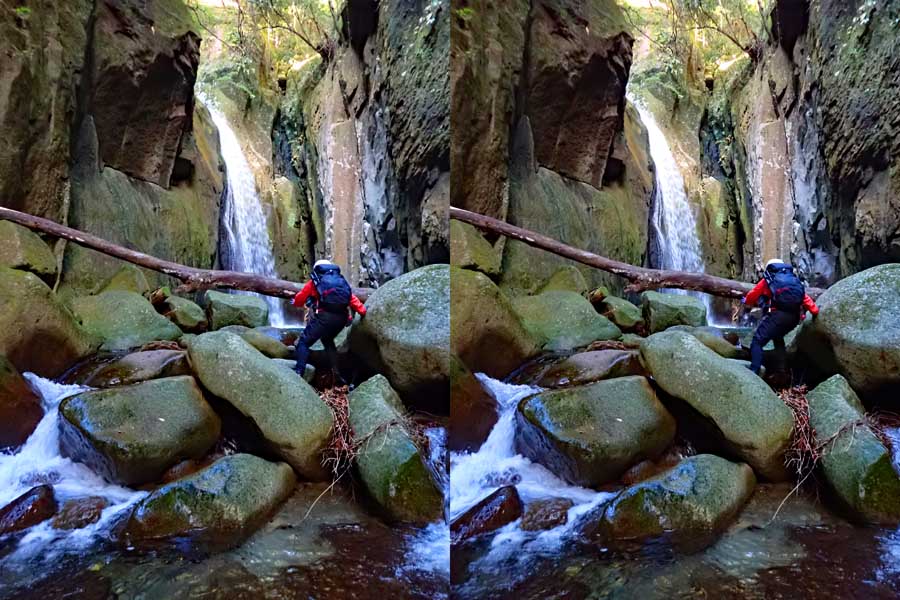 | この谷はゴーロが連続します。駐車場所から渡渉。以前は鉄橋があったのですが、大雨で流されたようです。滝の下流までは20分ほど右岸の滝見道を歩きます。 | ||||