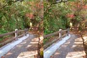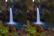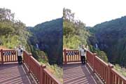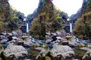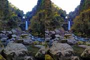 | 大きく下流側に回り込んでから川沿いに上流へ進みます。5分程度で滝が見えてきます。10分程度で滝前の観瀑スペースに到着です。広い滝壺に渇水期とは思えない水量で流れ落ちています。 | ||||