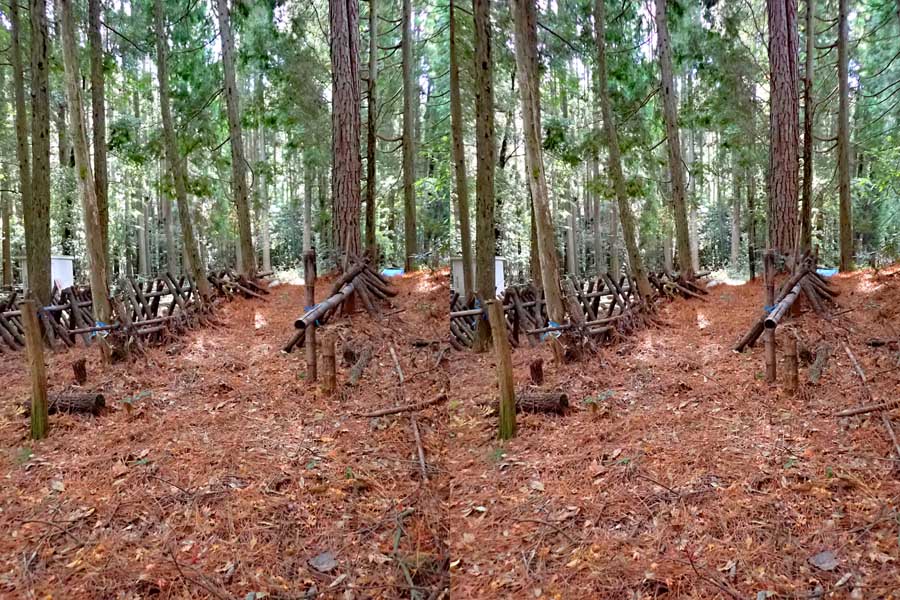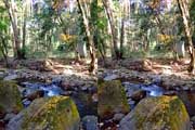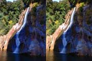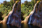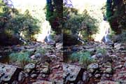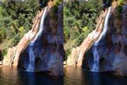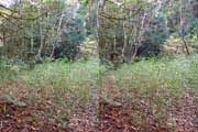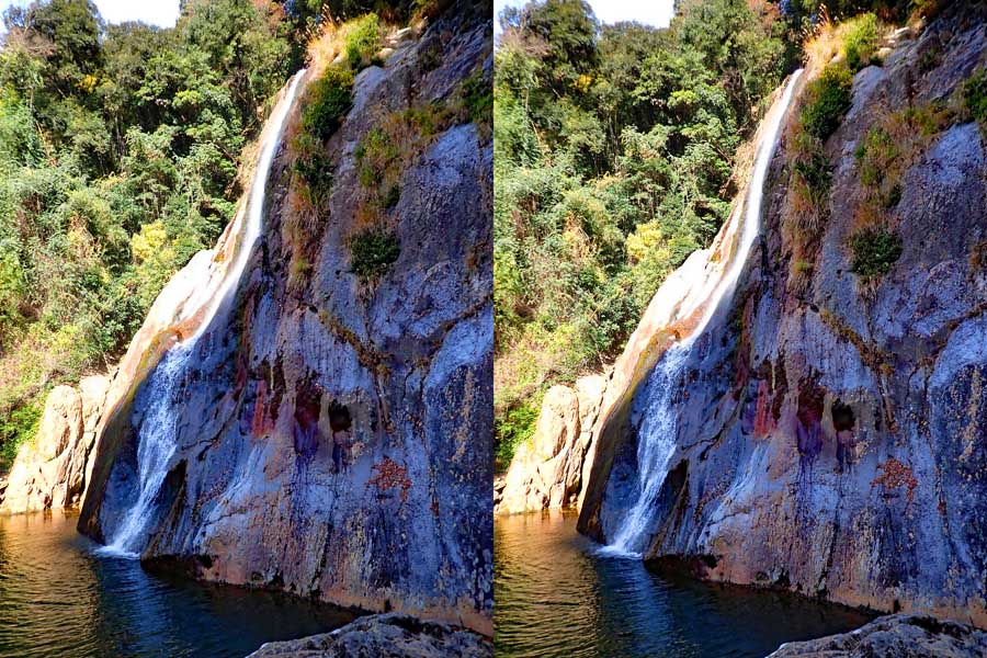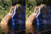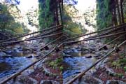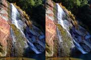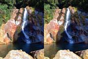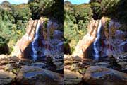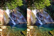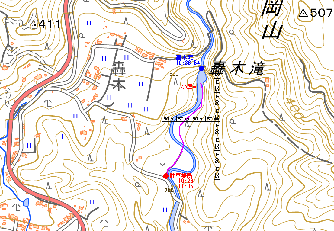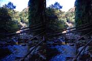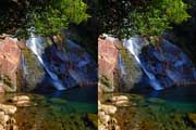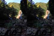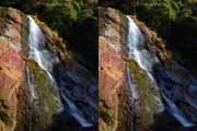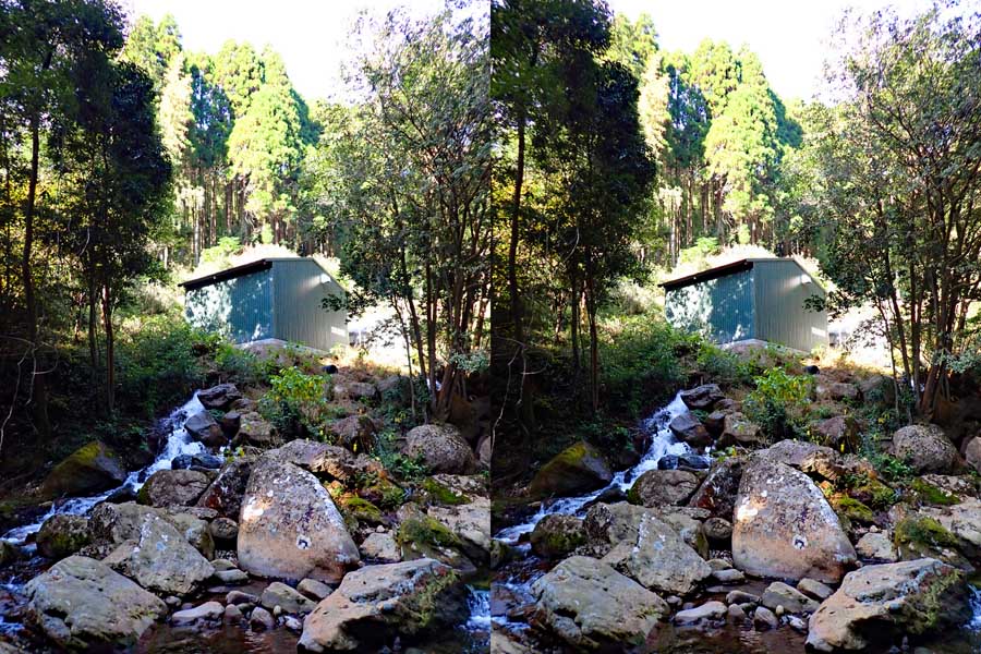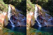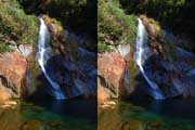 | 10:34 倒木の向こうに滝が見えてくる。近づくと左側からも流れが合流している。その流れの先には小屋があった。滝より上流で取水した水なんだろうか? 小屋があると云うことはこちら側にも滝見のルートがあるのだろう。 | ||||