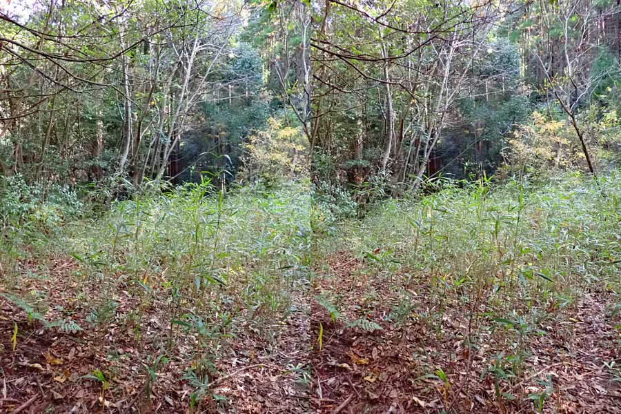 | 一度遊歩道が整備されたとの情報もあったのですが、その時に作られたはずの駐車場まですら入れなかったです。入口の車止めロープの前に駐車、10:28 鈴さんを残して単独で出発。10:29 車道終点、椎茸のホダ木が置かれていた。猿害は無いのだろうか? |