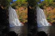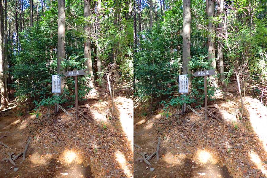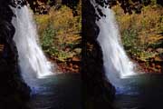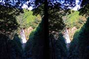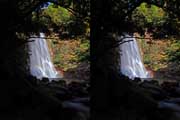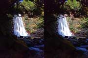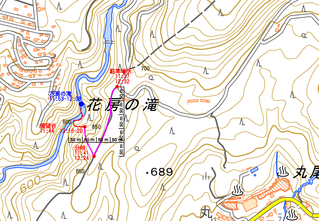 | 事前調査では下流側の『旅行人山荘』付近から北に歩くとあったが、駐車場所があるかどうか判らないのと、地図とにらめっこすると北から南に歩く方が近そうだったので、北に回る。遊歩道入口に駐車。単独だったら駐車するかどうかに悩むところだけど、鈴さんが車で待ってくれるので安心感があった。周辺は別荘地だと思われ、シーズンオフにはほとんど車も通らなさそうでした。11:37出発。緩やかな遊歩道を下る。途中で硫黄の臭いがする。パイプから温泉水が漏れているようだ。11:41展望台への分岐点。11:44展望台到着。さらっと撮影して川に向かう。急斜面を下ることになります。ハード系の滝屋ならロープ無しで下ること出来ます。途中で立枯れした木が倒れて滑落しかけた。油断大敵です。3〜40m下ると川です。 | ||