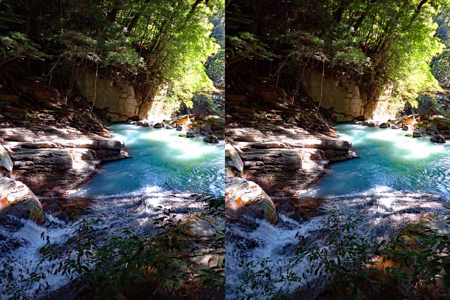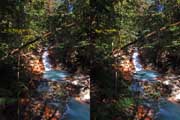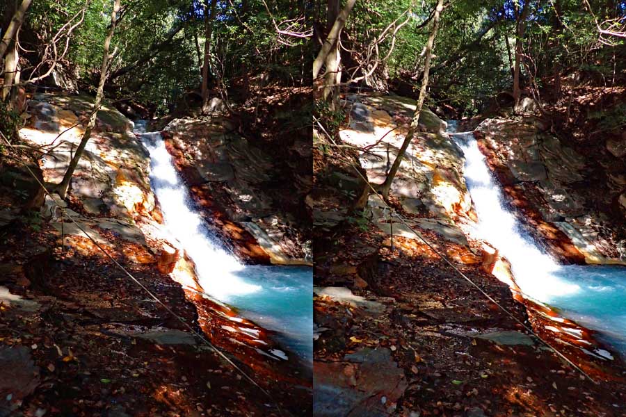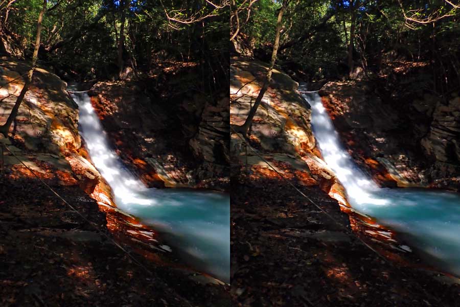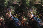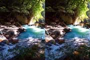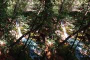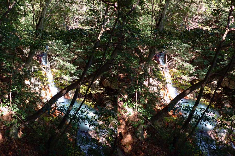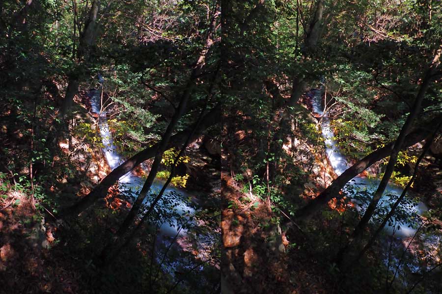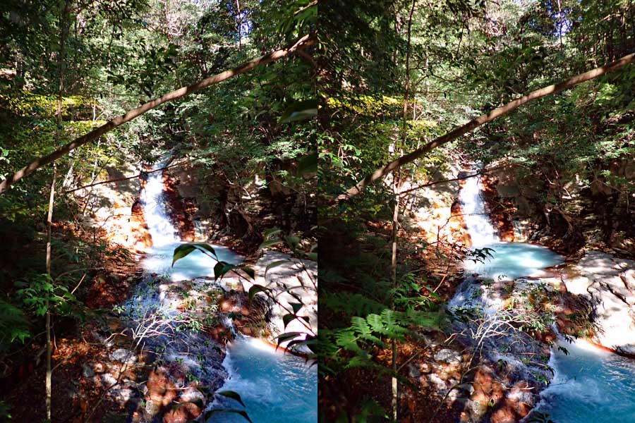 | 遊歩道(もしかしたら温泉パイプの管理道かも)を少し下ると眼下に白い流れが見えてくる。多分温泉成分の色だろう。道から撮影するが、木々が邪魔をしてうまく撮れない。 | |||