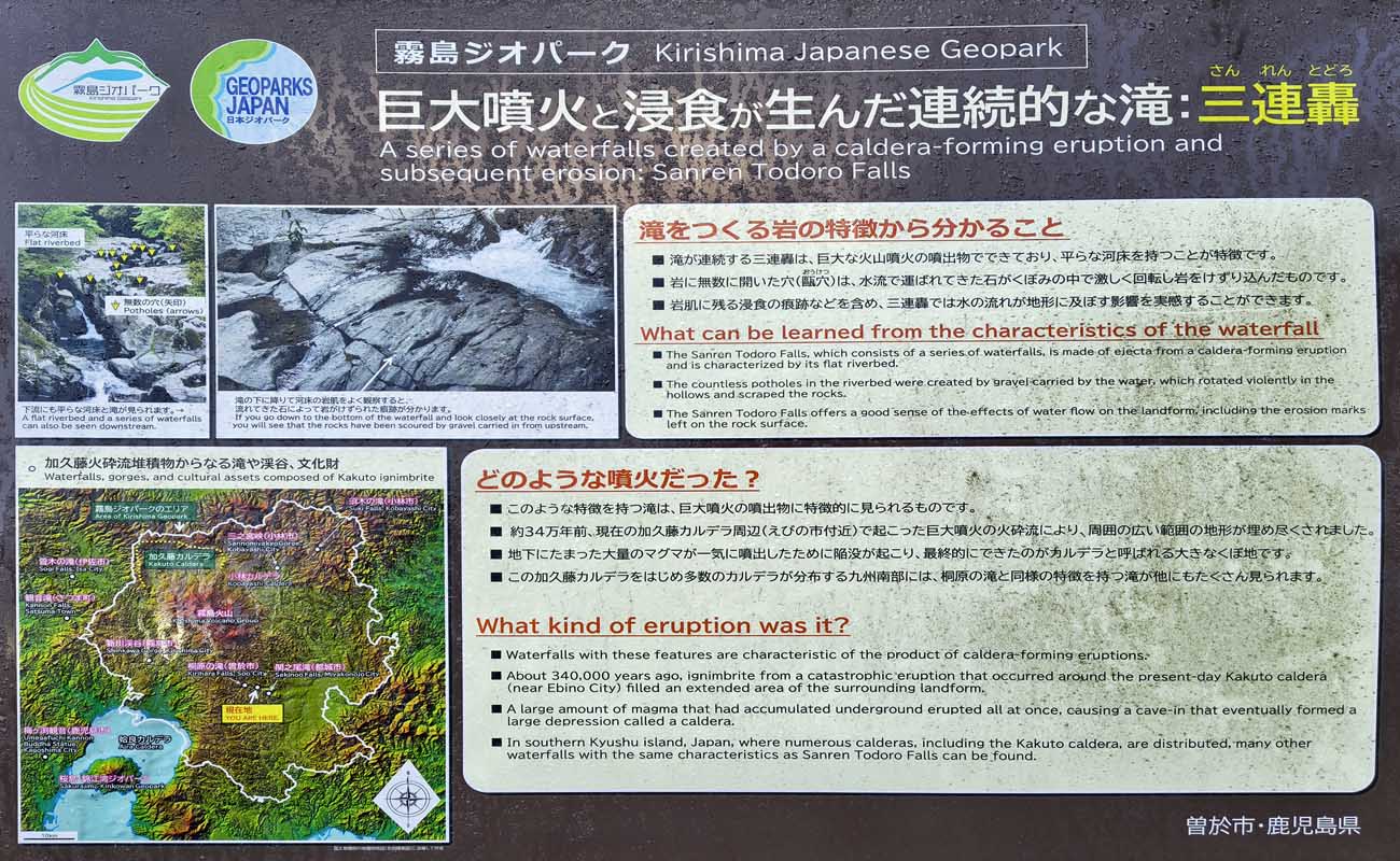 | 駐車場にはトイレと説明板がありました。特に進入禁止とかにはなっていませんが、滝見道の水害の被害が大きかったです。 水が無い・・・少ないとかでは無く水が無い。浸食された岩の豪快さは伝わりました。 |